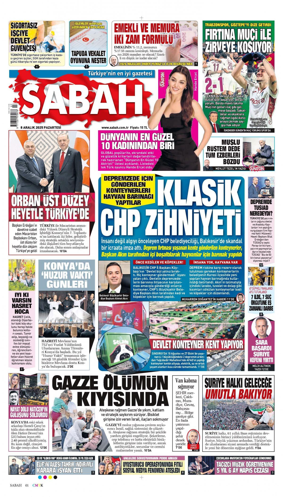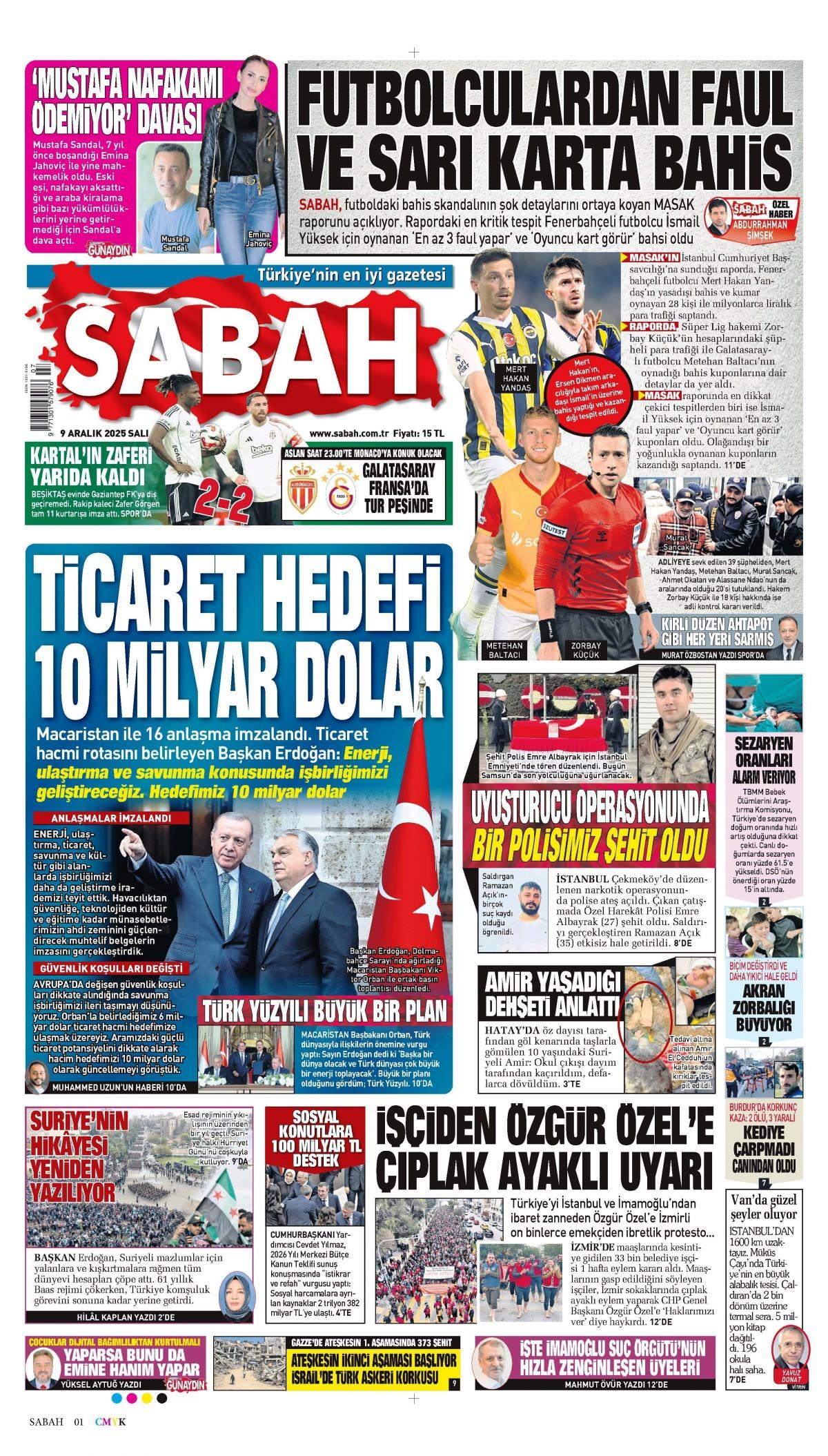 Sabah Gazetesi 9 Aralık 2025 Günü Manşeti