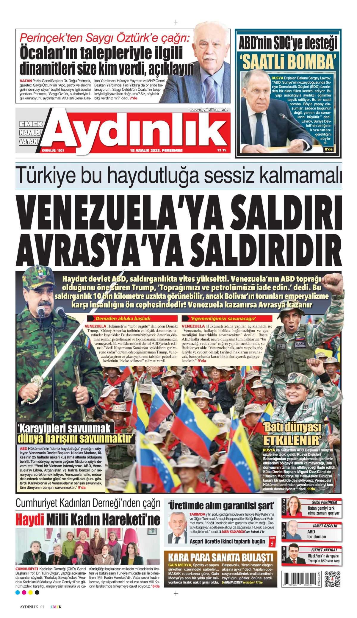 Aydınlık Gazetesi 18 Aralık 2025 Günü Manşeti