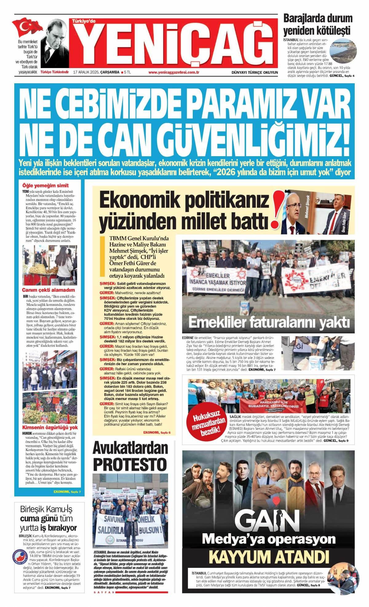 Yeni Çağ Gazetesi 18 Aralık 2025 Günü Manşeti